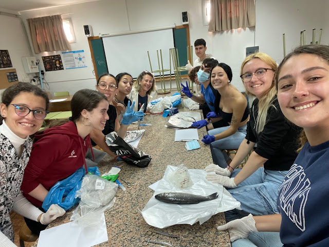El grupo de 1º Bachillerato de Ciencias de la Salud trabajó en la asignatura de Biología la disección de un pez para observar todos los órganos relacionados con la función de nutrición ( digestivo, respiratorio, circulatorio y excretor) , función de relación ( sistema nervioso) y la función de de reproducción ( aparato reproductor).
